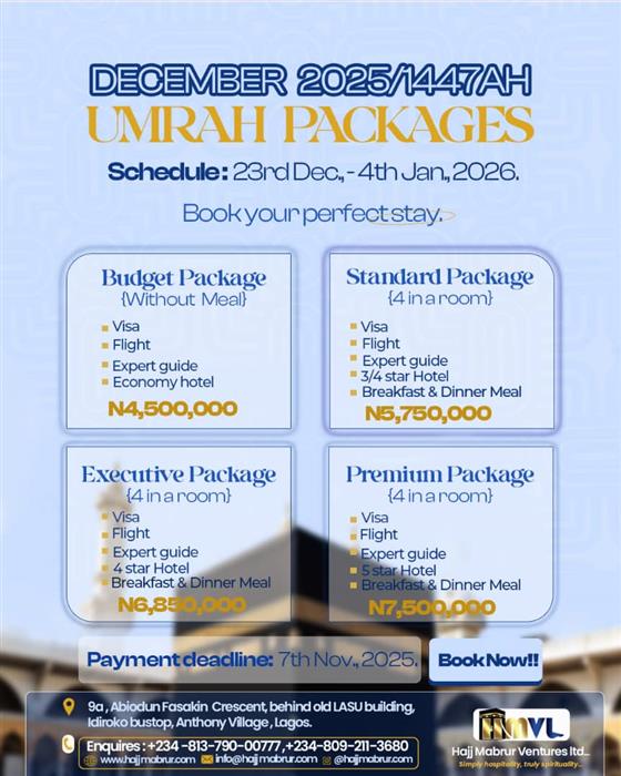 I performed hajj 2018 with HMVL and the experience was overwhelming, the services provided was an excellent one, from the staff, lectures and their hospitality was awesome, it exceeded my expectations. The accommodations both medina and mecca are easy accessible areas, close to Mosjid and haram, Muna was suitable for the purpose, the Arafat prayer was fully spiritual. i will be willing to go again with them and at the time encourage friends to go with them as i was also referred by a friend.